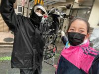 雨の中女性二人でタイヤにチェーンを巻くのである。